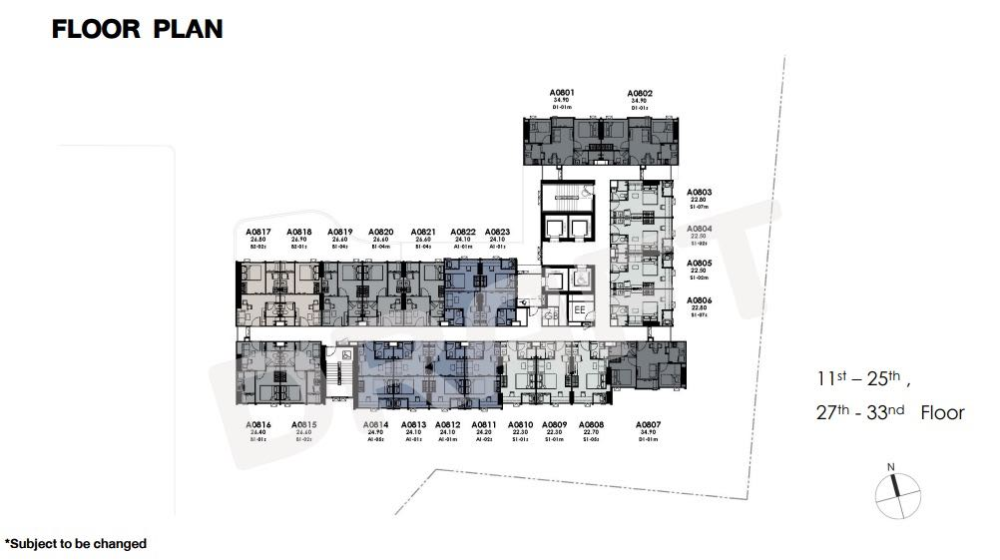 1 ห้องนอน 1 ห้องน้ำ ขนาด 24.4 ตรม. ชั้น 11 ตำแหน่ง A1113