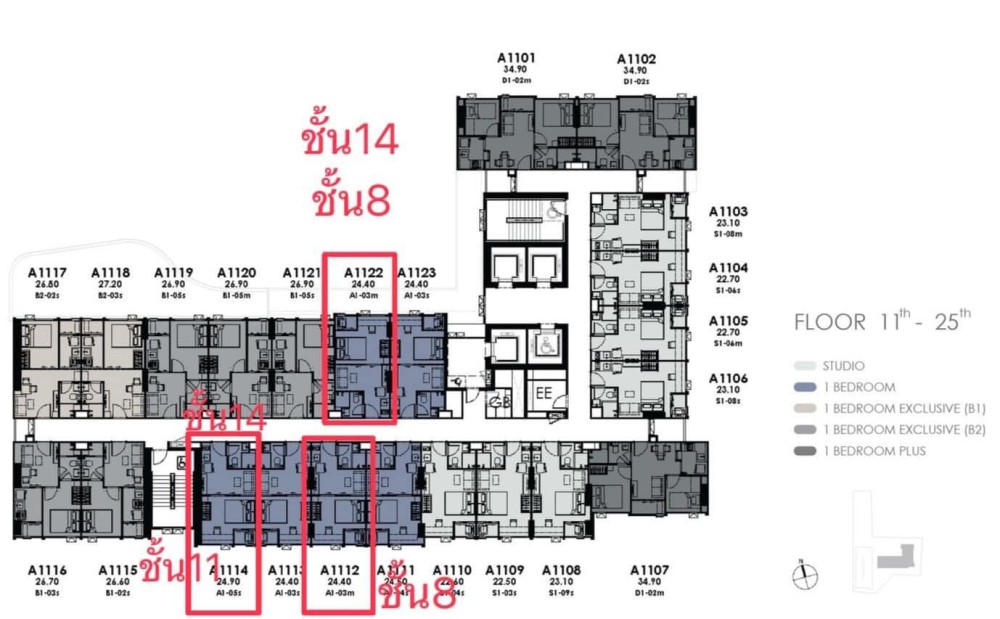 แบบ 1 BEDROOM 1 ห้องน้ำ ขนาด 24.9 ตร.ม. ชั้น 11 ตำแหน่ง 14